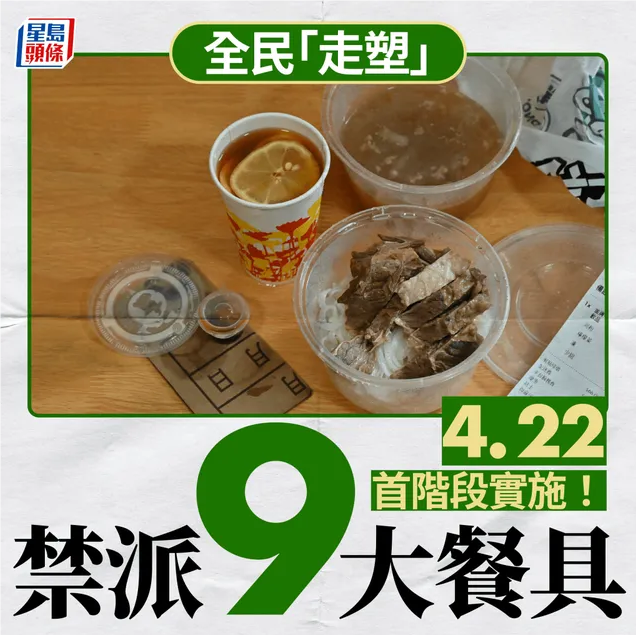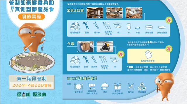 禁止向堂食及外賣顧客提供:發泡膠餐具、飲管、攪拌棒、進食用具(叉刀匙)、碟;