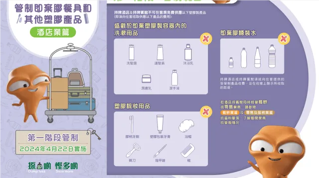 餐飲處所禁止向顧客提供9類即棄膠餐具,酒店也不可免費提供即棄瓶裝水、洗漱梳妝用品,商戶也不可派發即棄雨傘袋,銷售即棄塑料棉花棒、膠牙簽及牙線棒等物品。