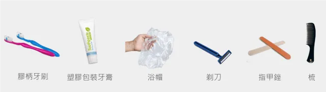 禁止免費供應:酒店洗漱梳妝用品…膠柄牙刷、塑料包裝牙膏、浴帽、剃刀、指甲銼、梳、塑料容器的身體清潔用品、房間內提供的即棄膠樽裝水;