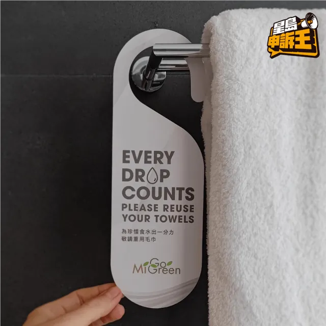 該酒店房務部總監表示,除了替代品配套到位,向客戶解釋減塑安排也相當重要,酒店每轉用一件洗漱用品時,都會為員工安排培訓、簡報,讓他們了解公司最新安排,以便向住客解說情況。此外酒店亦從細節入手,在房間擺設一些提示紙卡,例如鼓勵重用毛巾,減少不必要浪費。
