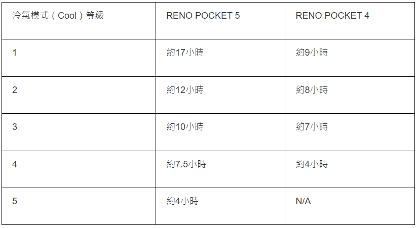 不只第4級冷氣模式使用時間大幅延長,事實是RENO POCKET 5每個等級的續航都比上代高出不少,只開1級的話,續航力竟達到17小時,2級亦可用足12小時,值得留意的是,RENO POCKET 5的冷氣模式新設最高第5級,制冷效果進一步加強,在35℃高溫環境使用5分鐘,可將身體表面溫度降至23℃,這個最強的制冷模式可連續使用4小時。跟過去兩代一樣,RENO POCKET 5在USB供電情況下,可將制冷效果再提升至第5+級。