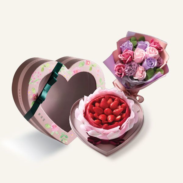 草莓麻糬千層心型花盒配日系香皂花1束(限量200個):$589;早鳥86折優惠:$506.6