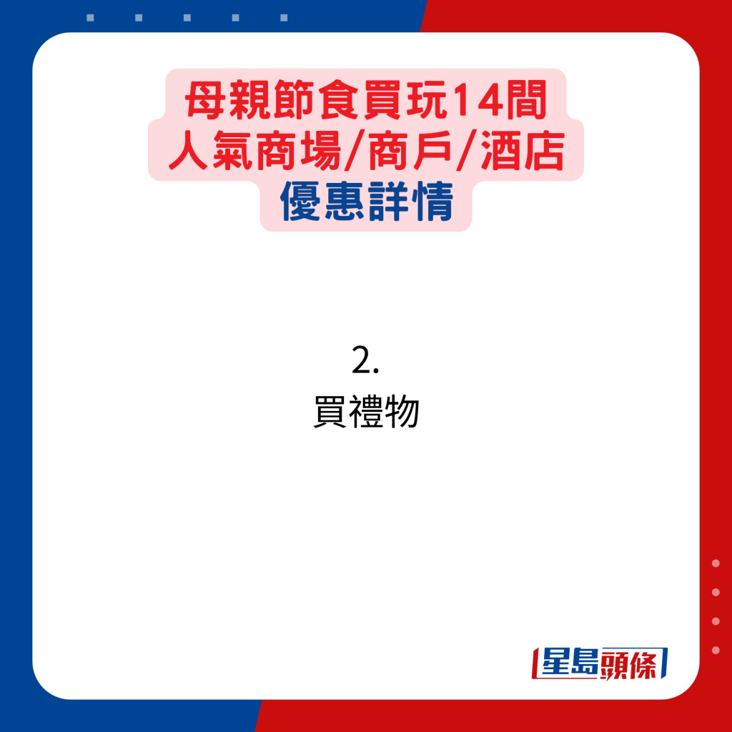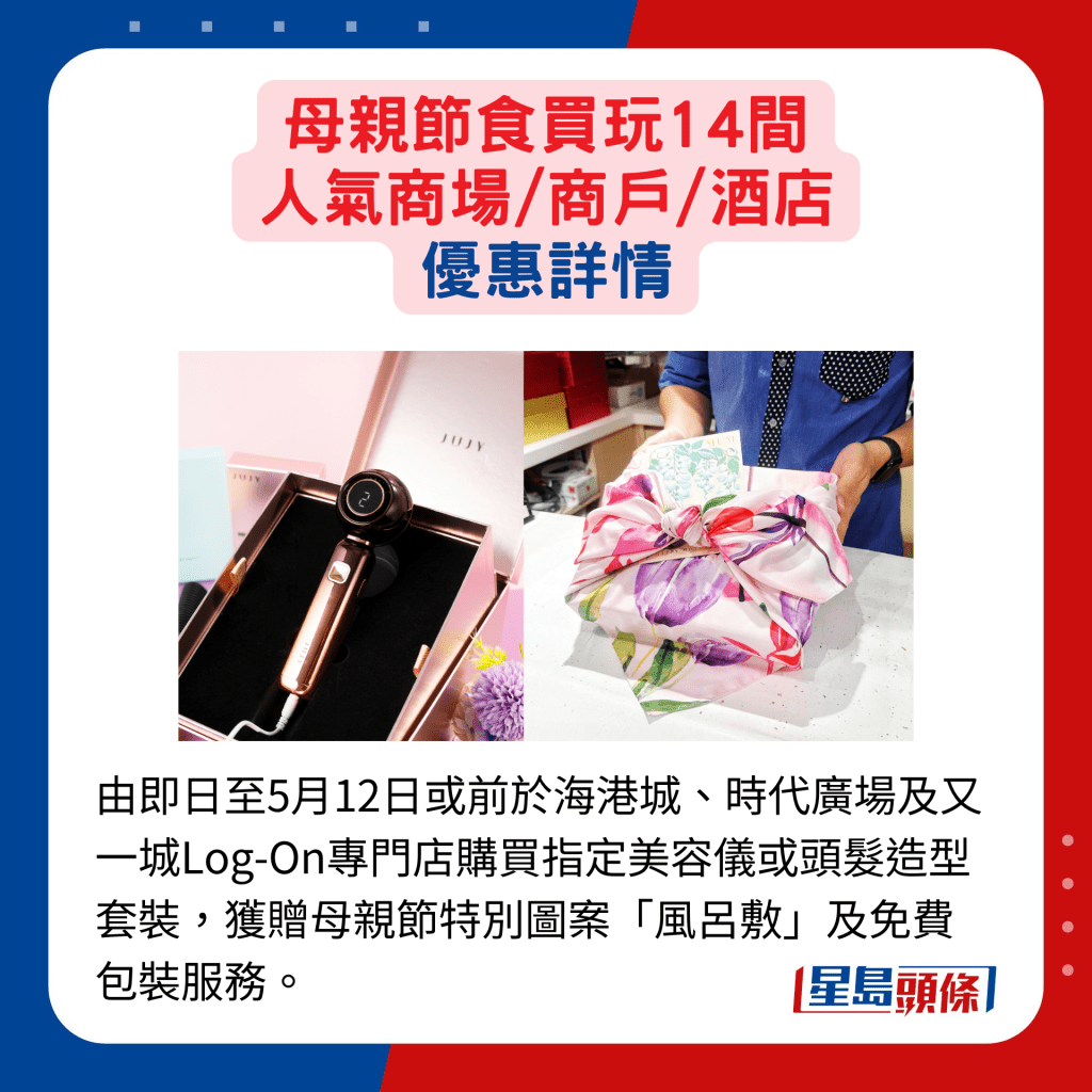 人氣百貨及商場商戶都有推出迎合母親節的推廣活動,產品網羅時裝配飾、護膚及美妝品等。崇光百貨由即日至5月26日舉行感謝祭,逾百國際品牌的指定產品提供不同折扣優惠,SOGO Rewards會員買滿指定金額,更可獲現金券或以優惠價換購指定產品等。想選購美妝護膚品的話,朗豪坊由即日至5月12日舉行Langham Beauty Fest S/S 2024,逾60個國際美容品牌如Shiseido、SK-II、YSL BEAUTé、Armani Beauty及IPSA等,推出超過300款低至3折的獨家禮遇、配搭優惠及限量激賞,例如Shiseido指定眼膜買一送一,另價值$2,050的IPSA亮白凈斑精華套裝,就減至$820發售。