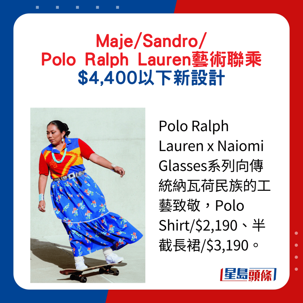 民族風的設計向來有捧場客,要數今季的特色新作,首推Polo Ralph Lauren跟第七代納瓦荷族印第安編織技匠Naiomi Glasses,合推的第二彈Color in Motion別注系列。 今次繼續頌揚傳統納瓦荷民族的工藝,項目包羅半截長裙、Polo Shirt及恤衫等,選用鮮艷的藍綠、紅、橙及黃色,并運用當代演繹手法將之融入傳統的納瓦荷編織圖案中,其中的十字及之字紋設計,搶眼又特別。