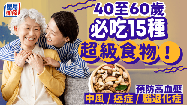 40歲、50歲及60歲以上人士,宜吃什么食物保健養生,以防“無聲殺手”?年紀漸長,要多吃果仁?有營養師提醒,不同年齡或性別的人士,身體出現的變化不同,需要攝取的營養也不同。 她推介15種超級食物,適合3大年齡層人士,以預防常見的高血壓、中風、癌癥、腦退化癥等問題。