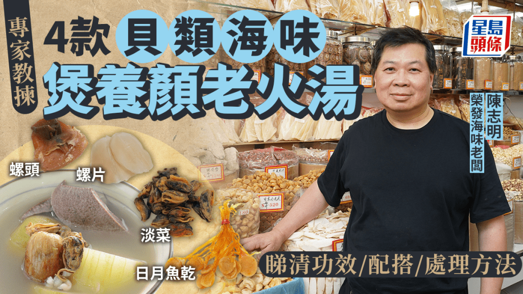 海味湯|曬干的貝類海味,如螺頭、螺片、日月魚干及淡菜,味道特別鮮香濃郁,是常用湯水材料,并且各具食療功效。今日由灣仔榮發海味的負責人陳志明,講解螺頭、螺片、日月魚干及淡菜的選購方法、處理方法、功效及煲湯配搭,讓食材發揮最佳的味道及功效,煲出鮮味有營的食療湯水。
