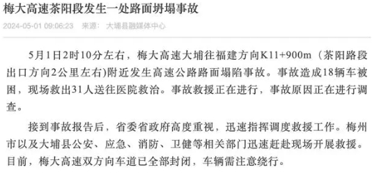 5月1日早上,梅州市公安局交警支隊發布交通繞行提示,廣東梅龍高速(S12)梅州往福建方向K11+900m道路塌陷,雙向封閉,車輛需繞行。大埔縣融媒體中心發布消息,事故造成18輛車被困,現場救出31人送往醫院救治。