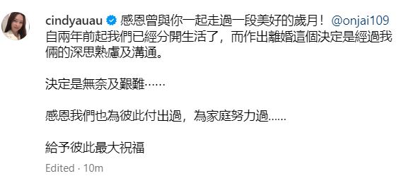 郭晉安與歐倩怡于2006年結婚,育有一子一女,不過今日(2日)二人宣布離婚,更透露已分居2年。郭晉安與歐倩怡分別于社交平臺公布離婚消息:“感恩曾與你一起走過的歲月!自兩年前起我們已經分開生活了,經過雙方深思熟慮及溝通,最后,我們決定離婚了。這個決定是無奈及艱難??感恩我們也曾經為彼此付出過,為家庭努力過,最后寄予你最大的祝福!”