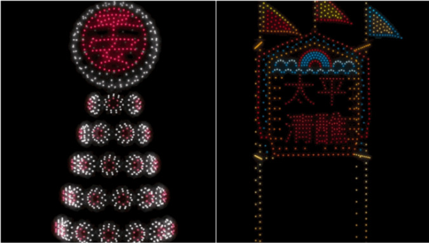 無人機表演將于晚上8 時在灣仔海濱對出海面上演,長約 10 分鐘。表演由 1,000 架無人機拼湊出多幅以佛誕及太平清醮兩大傳統節慶為主題的動態圖案,包括60米立體巨型平安包、太平清醮花牌等。