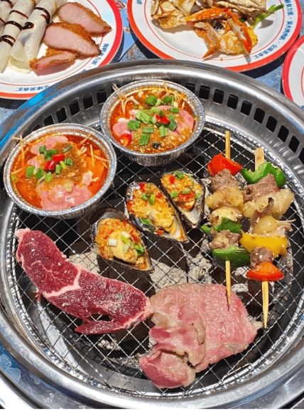 “煙火碼頭海鮮Bazaar自助”占地逾3,000呎,可讓500人同時用餐,環境非常闊落。每張臺更設有炭火烤爐及電磁爐,既可燒肉又可以打邊爐?,F場提提超過500款美食,分為不同的美食區,包括鮮活海鮮、炭火原切烤肉、鐵板燒、燒烤、日本料理、火鍋涮肉、現烤芝士海鮮、粵式熟食、蒸點燉盅、水果、甜品等。當中推介的就有現撈活蝦、蜆、蟶子、海螺,以及高壓鍋生蠔、澳洲和牛、鮮切潮汕牛肉、佛跳墻、現炒酸奶等,無論是燒烤、火鍋、鐵板燒也相當吸引!水果、甜品及飲品區亦不失色,每區都有數十款選擇,猶如去了另一個超市般,難怪有網友稱在這里用餐是“超霸氣”、“吃完真的要扶墻而出”。