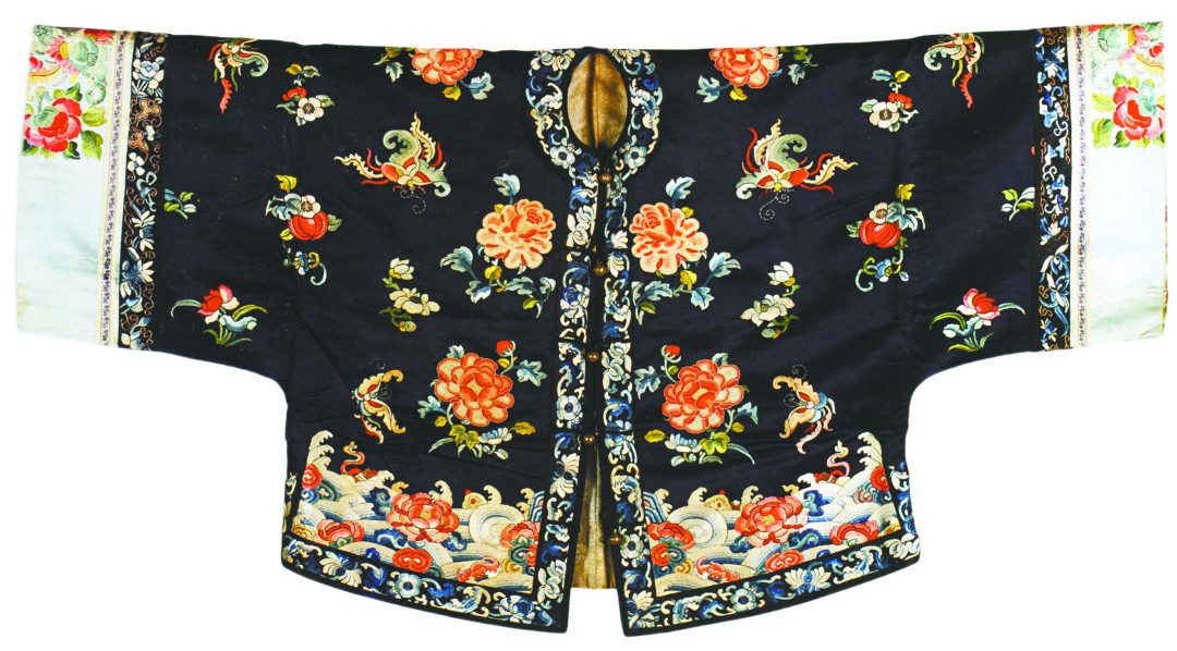 ▲清末藍緞地廣繡花蝶紋對襟漢式氅衣