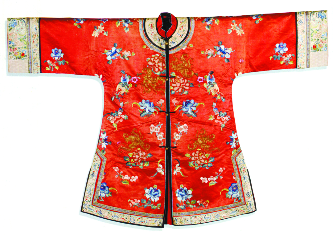▲清末紅緞地廣繡金線繡花卉紋對襟漢式氅衣