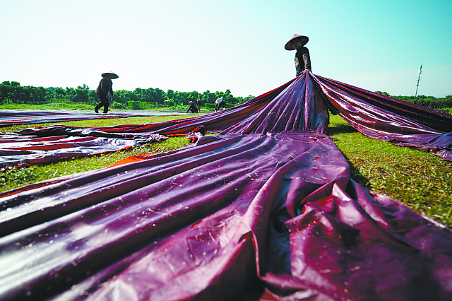 “荔熟蟬鳴云紗響,蔗浪蕉風莨綢爽”,香云紗觸感爽滑、穿著涼快,且會隨著時間慢慢褪去涂層,露出褐黃底色,因此穿洗越多越久,便越柔軟值錢,有“軟黃金”的美名。