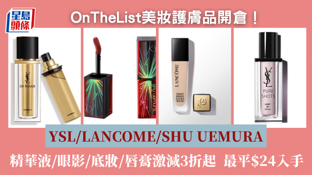 OnTheList美妝護膚品牌開倉優惠低起3折!由即日起至5月12日,OnTheList購物平臺網站推出美妝護膚品開倉大減價,L'Oréal旗下化妝品牌包括YSL、LANCOME、植村秀SHU UEMURA等,多款護膚精華液、眼影、皇牌唇膏以3折起發售,想趁減價為化妝品及護膚品換季,記得留意優惠詳情!