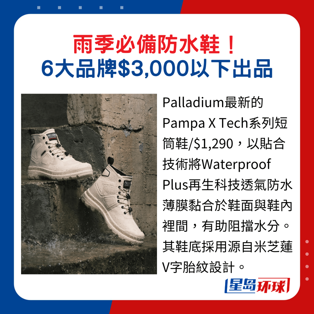 短靴款近年大熱,擁有三張英國皇室認證的英倫品牌Barbour推出的短筒矮跟雨靴,從品牌經典的Chelsea靴款擷取靈感,鞋身用上拼色格紋與單色設計,滿載英倫韻味,以之配襯短褲或短裙,能凸顯修長美腿。 來自法國里昂的軍靴品牌Palladium以防水鞋打響名堂,今季新品中的Pampa X Tech系列短靴款,鞋面采用雙重防水涂層處理,配搭貼合技術將Waterproof Plus再生科技透氣防水薄膜黏合于鞋面與鞋內櫳,防水又透氣,鞋底則用上源自米芝蓮獨特的V字形胎紋,配以蜂巢式彈力透氣鞋墊,提升穿著時的穩定性與舒適感。