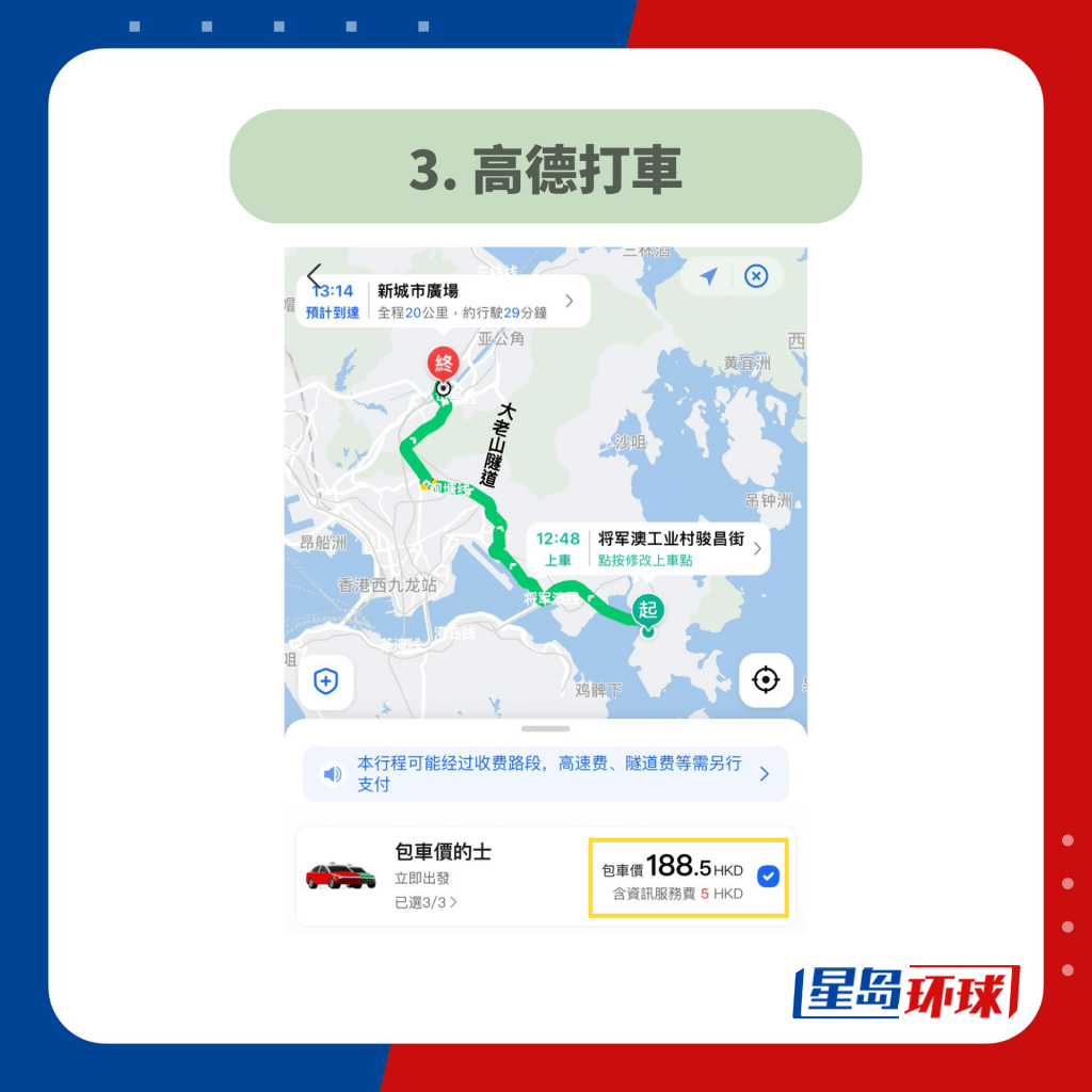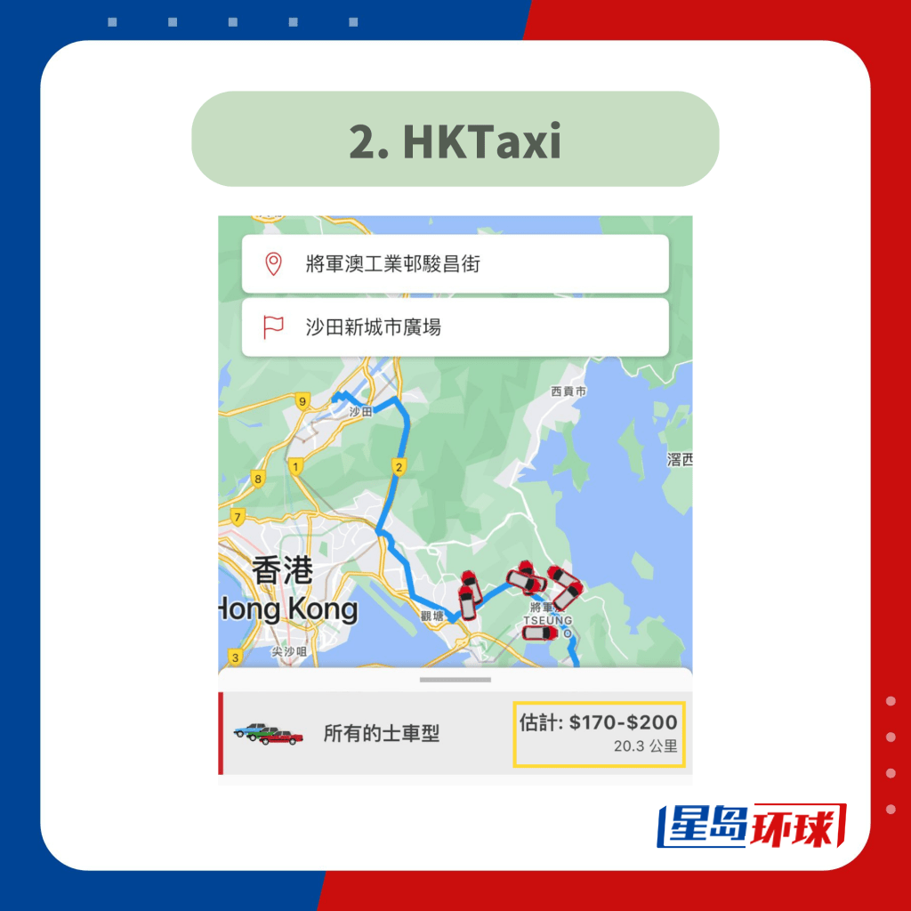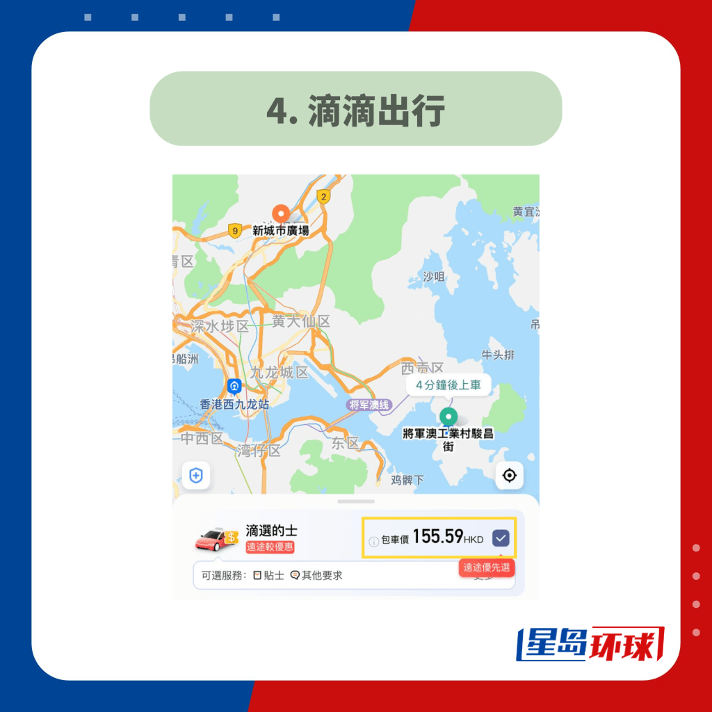 《星島》網記者分別比較Uber、HKTaxi、高德打車及“滴滴出行”四個網約車平臺的車費,計算從將軍澳工業村出發,至沙田新城巿廣場的費用。