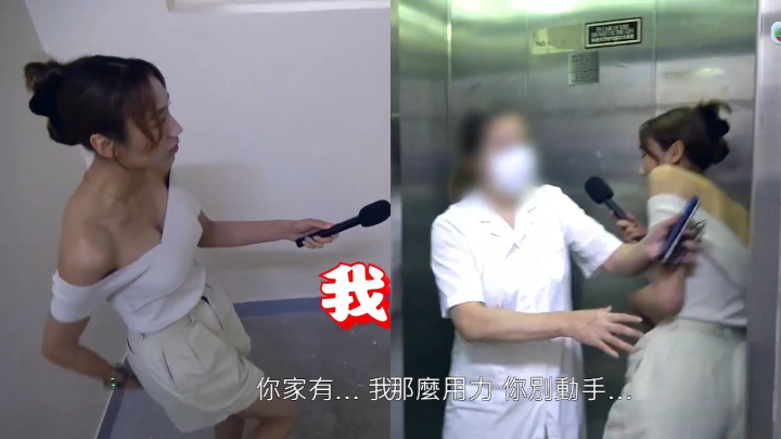 不過阿紅立即沖往后樓梯,黎寬怡與攝制隊繼續緊隨其后,黎寬怡再度追問治療服務時,阿紅發難大叫:“我屋企有老人家?!我仔都有病?!你咁樣搞我做咩啫?我犯咩法???”然后一邊行樓梯,黎寬怡繼續問是否故意為男客人做服務,阿紅鬧爆黎寬怡:“放屁!”黎寬怡竟然搞笑反問:“點樣放屁法???”阿紅連跑9層樓梯到大堂向保安求助,繼續發難:“咁樣點搞???咁樣系騷擾民宅?!睙o人理會的阿紅又想搭電梯上樓,黎寬怡繼續緊隨,她又再推撞黎寬怡,黎寬怡更說:“佢超大力??!”然后再走向后樓梯位置:“我唔同你講,我而家報警!唔好嘈!”