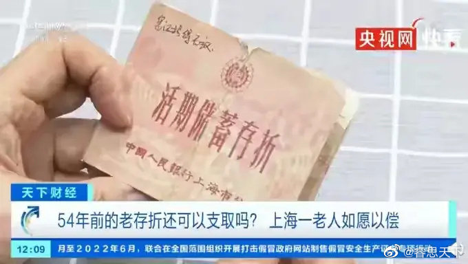 中國人都有存款的習慣,認為把錢放進銀行里,不僅保險,還有利息。有一名上海的老婆婆,不久前在家中大掃除時,發現了一本1967年的存折,內4.18元存款。她拿到當地銀行,銀行職員決定認真對待,查找“這筆錢”的下落。結果花了兩天,認為“這筆錢”可以提取,連利息為7.55元。