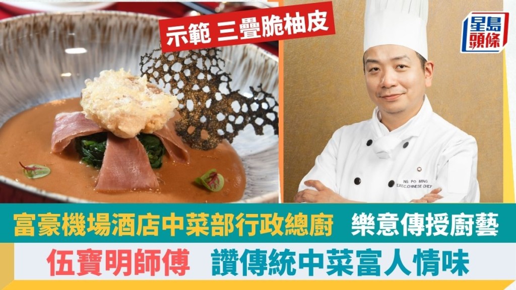 中國人喜歡圍坐一桌齊齊起筷,分享佳飫,伍寶明師傅(富豪機場酒店中菜部行政總廚)尤其欣賞這種熱鬧的傳統用餐氣氛,今日他為大家示范的三疊脆柚皮,正是傳統菜式的變奏版,新舊烹法并用,既保留傳承亦與時并進。