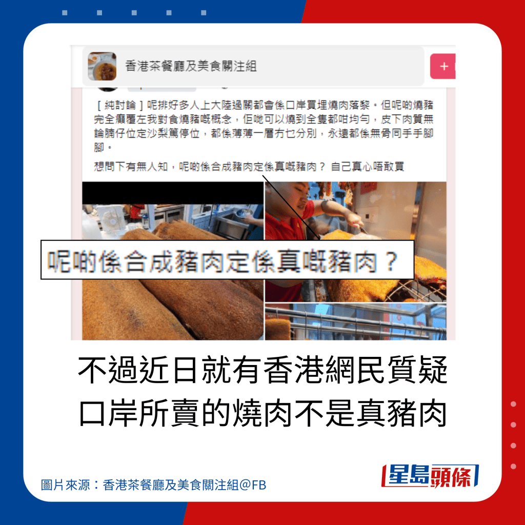 近日,卻有造假疑云在香港網上討論區傳出。有香港網友質疑,口岸所賣的燒肉不是真豬肉。這位網友上載了數張內地關口附近燒味檔的相片,從相片可見,深圳的售賣方式與香港一般的燒味檔口不同。