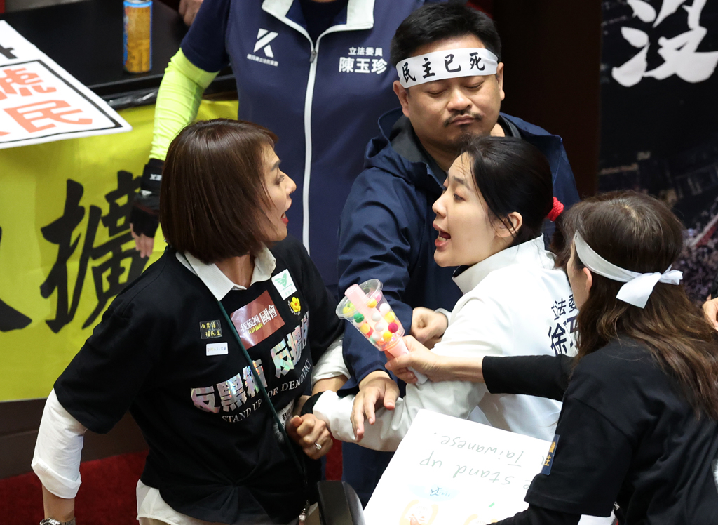 ▲邱議瑩(左)沖上前打了羅智強,并欲揮掉羅的直播手機,徐巧芯(右)見狀也沖上前聲援,并與邱發生拉扯。 中時資料照