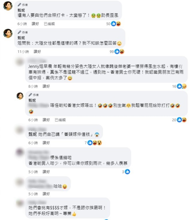 與網民討論嫁港漢的原因時,甄妮坦言不懂回答:“姐問我:大陸女性都是這樣的嗎?我不知該怎么回答”,甄妮更認為是助長歪風:“還有人要與他們合照打卡,太變態了!助長歪風”、“一上街就丟他她臭雞蛋,看你再囂張。不用給臉,連《東張》一起丟,助肘為虐,拒看?!?/p>