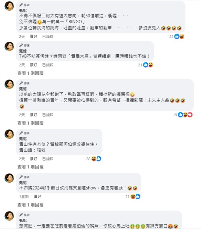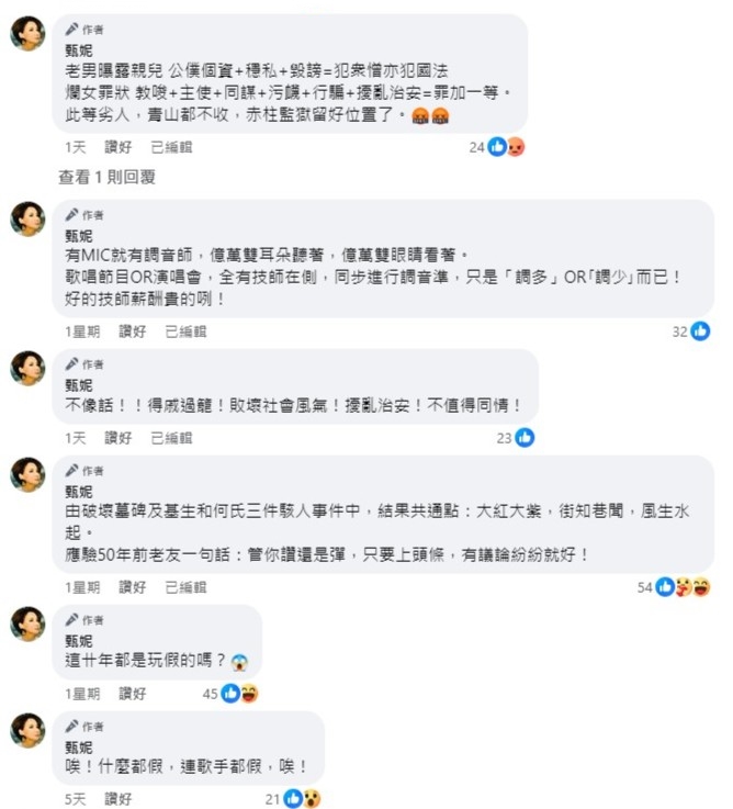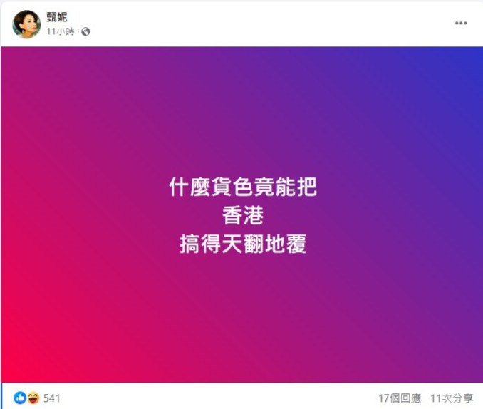 71歲的甄妮雖然已淡出幕前多年,并長居臺灣,但一直有留意各地娛樂新聞,又會在個人Facebook論盡圈中事。早前為《中年好聲音2》亞軍譚輝智抱不平,引發與評判之一的伍仲衡隔空開火,又提及李龍基和未婚妻王青霞、黃家駒墓碑被毀,最新是關注何伯及新何太的報道。甄妮今日在FB留言:“什么貨色竟能把香港搞得天翻地覆”。