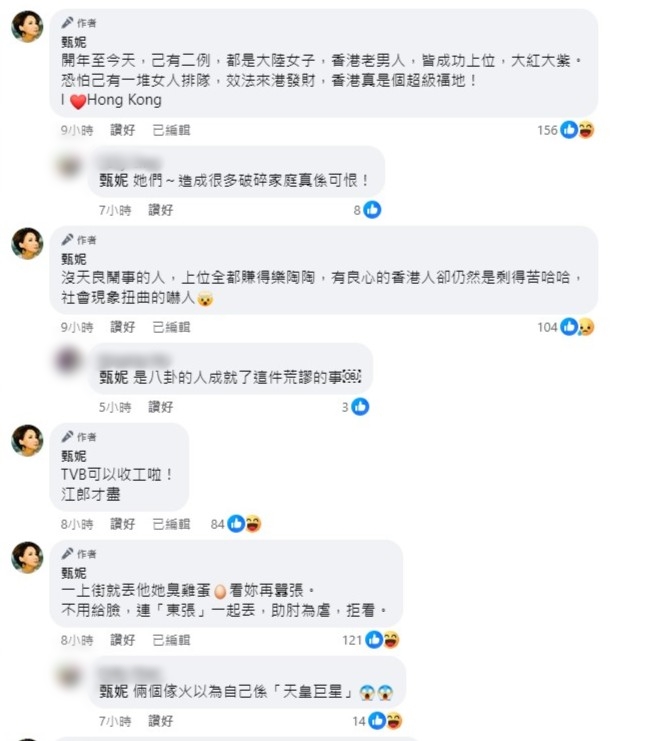 甄妮在帖文未有開名,卻在留言續寫道:“開年至今天,己(已)有二例,都是大陸女子,香港老男人,皆成功上位,大紅大紫??峙录海ㄒ眩┯幸欢雅伺抨?,效法來港發財,香港真是個超級福地!I Love Hong Kong!沒天良鬧事的人,上位全都賺得樂陶陶,有良心的香港人卻仍然是剩得苦哈哈,社會現象扭曲的嚇人?!闭缒葜霸诹硪惶闹背猓骸袄夏衅芈队H兒,公仆個資+穩私+毀謗=犯衆憎亦犯國法。爛女罪狀:教唆+主使+同謀+污蔑+行騙+擾亂治安=罪加一等。此等劣人,青山都不收,赤柱監獄留好位置了?!?/p>
