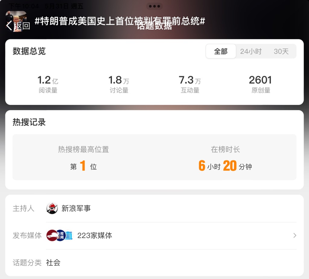 特朗普定罪的新聞上了中國社交媒體平臺微博和搜尋引擎百度的熱搜榜榜首,昨天下午之前微博已有超過1億2000萬人點閱。在抖音上,特朗普被定罪也進入了熱榜前五。