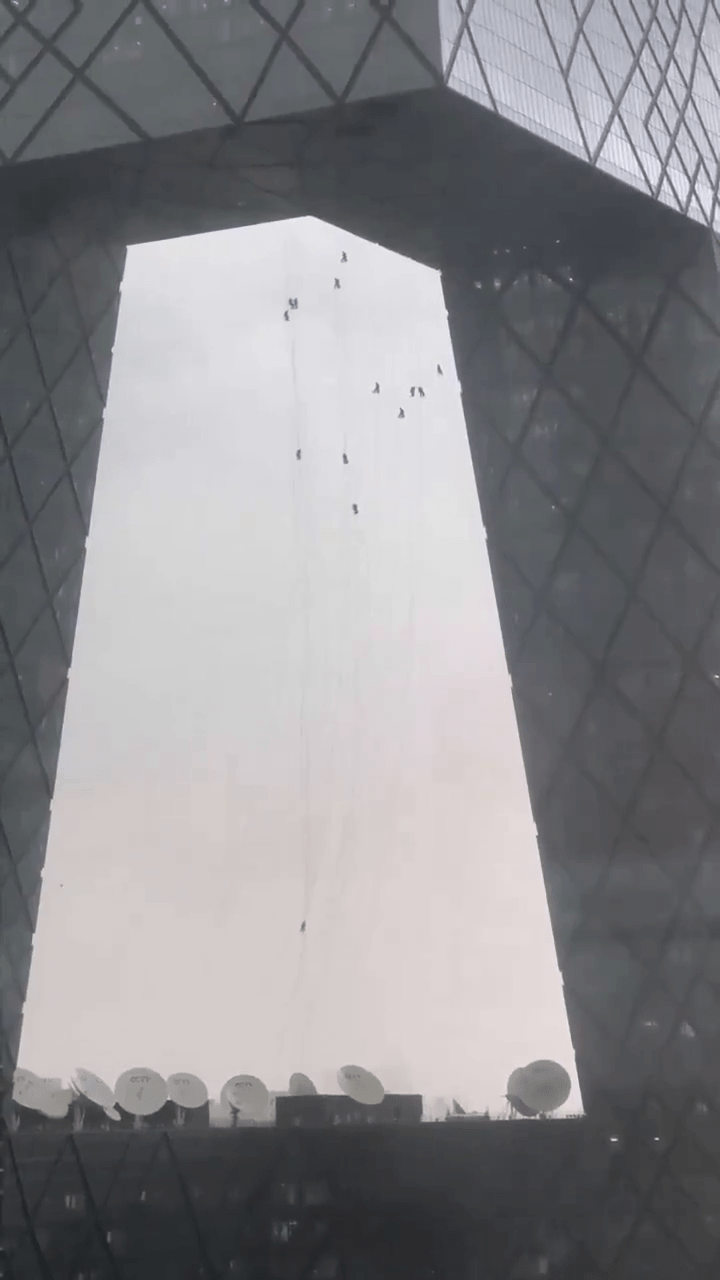 ▲央視大樓15名洗窗工人高空隨風搖擺。