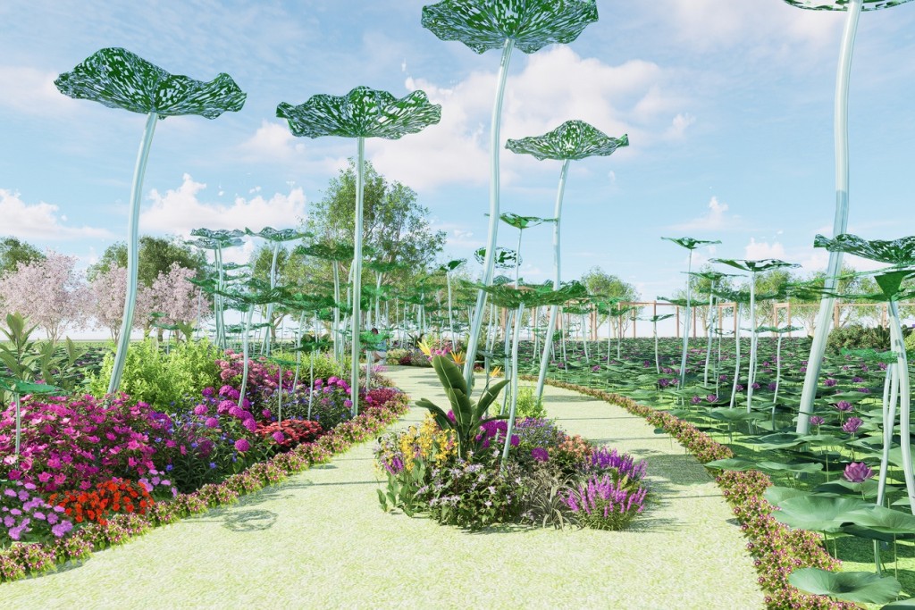 ▲第二區“霧送荷香飄神州”,位于展場的中央區,設置了縱橫交錯的神州大道及高低錯落的荷葉藝術裝置。