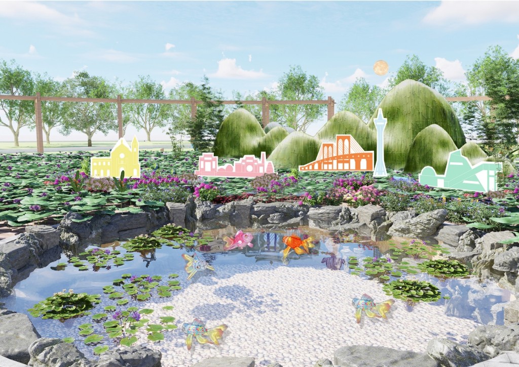 ▲第一區“蓮花福地”,通過荷塘拱橋連接八個澳門名勝裝置,以風景長廊的方式呈現具有澳門特色的人文和自然景觀。