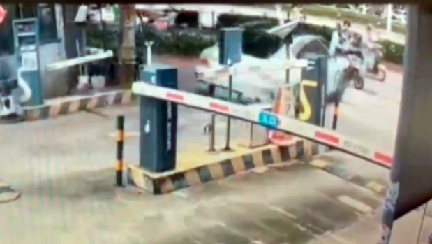 閉路電視影片顯示,這輛小米SU7持續加速沖出停車場出口柵欄,隨即撞到行經慢車道的電動單車與路人,接著跨越分隔島后才停在快車道上。