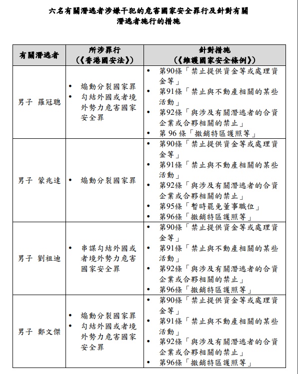 6名被指明的有關潛逃者包括男子羅冠聰、男子蒙兆達、男子劉祖廸、男子鄭文杰、男子霍嘉志及男子蔡明達,各人在竄逃英國后仍繼續從事危害國家安全的行為和活動,警方遂依法向法院申請拘捕令,并分別于2023年7月及12月通緝各人。
