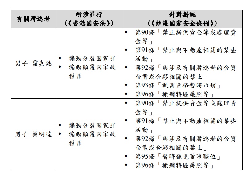 以下四項措施,就全部6名有關潛逃者而適用:“禁止提供資金等或處理資金等”、“禁止與不動產相關的某些活動”、“與涉及有關潛逃者的合資企業或合伙相關的禁止”及“撤銷特區護照等”。此外,“執業資格暫時吊銷”及“暫時罷免董事職位”的措施,就個別有關潛逃者而適用。