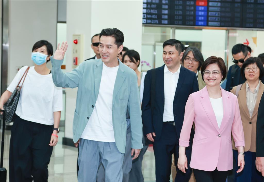 ▲胡歌昨早抵臺,一路上開心揮手微笑向媒體及粉絲打招呼。中時新聞網