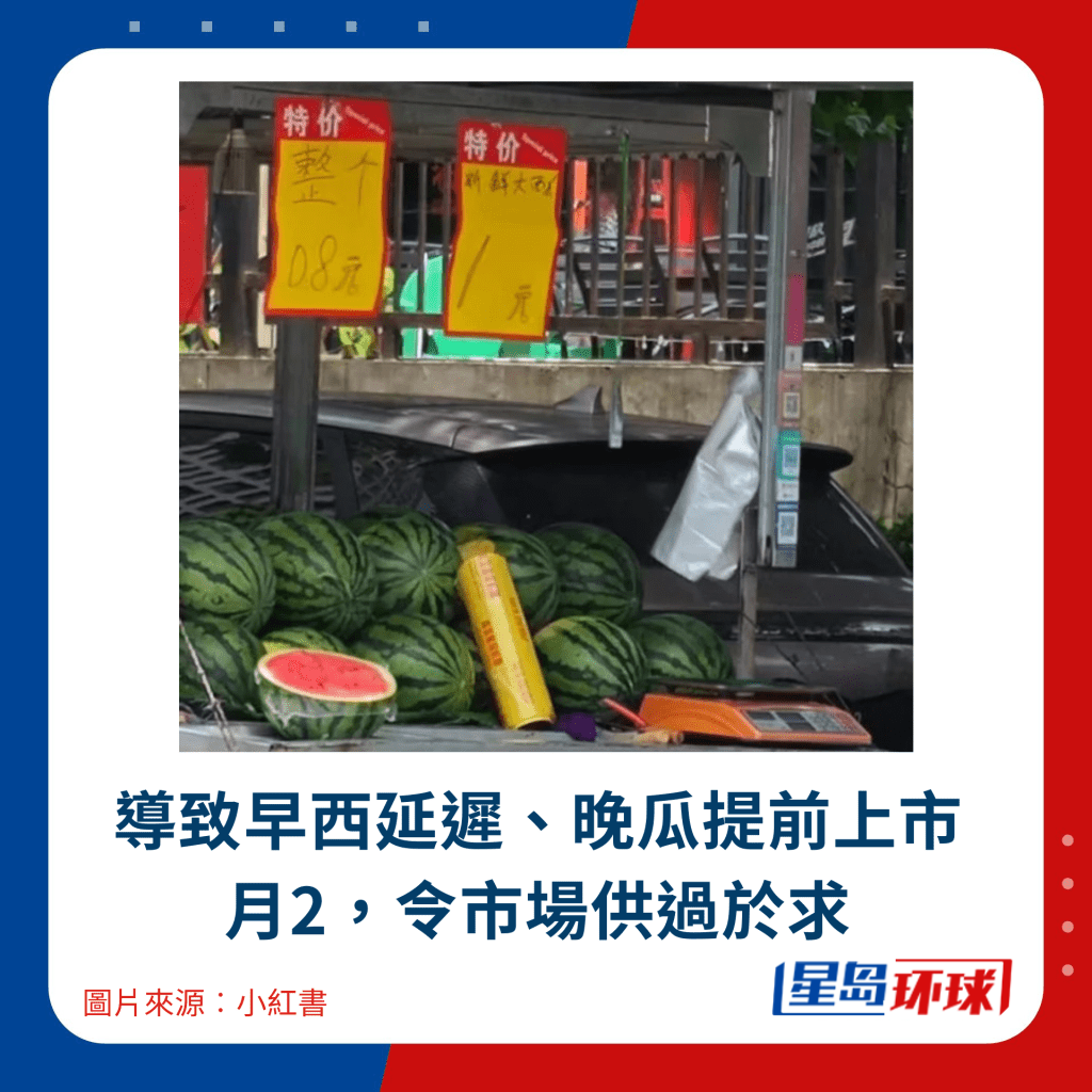有深圳網民收工行超市時,發現西瓜劈價至¥0.98/斤,不用一元,說在深圳住了5年是第一次見,非常意外“深圳居然有這物價”。另一位網民則去附近街市買餸時看到一架大貨車在賣麒麟西瓜,每斤¥1.5,買一個只需¥19.8,大贊“今天吃瓜自由”。