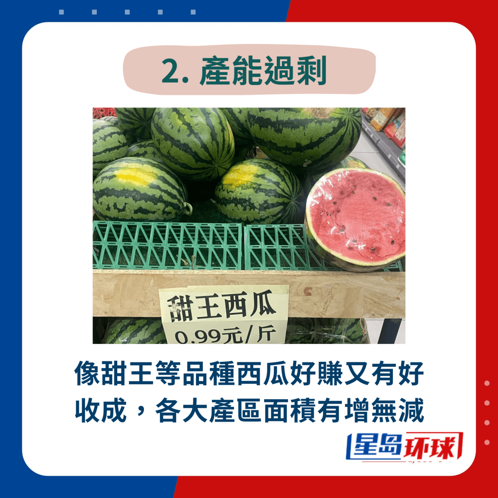 究竟為何今年的西瓜會賣得這么便宜?有內地農民就解釋,近期西瓜價格下跌有4大原因,主要原因是天氣影響,令西瓜產量增多,要大幅劈價賣出,否則會滯銷。加上消費者近年更“識食”,購買西瓜時會較著重口感及味道,令一些品種如黑皮、甜王等沒人購買,要大幅降價促銷。