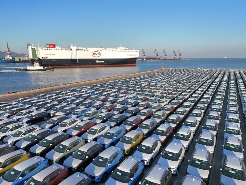 ▲山東煙臺港的比亞迪貨船和準備出口的電動車。中新社