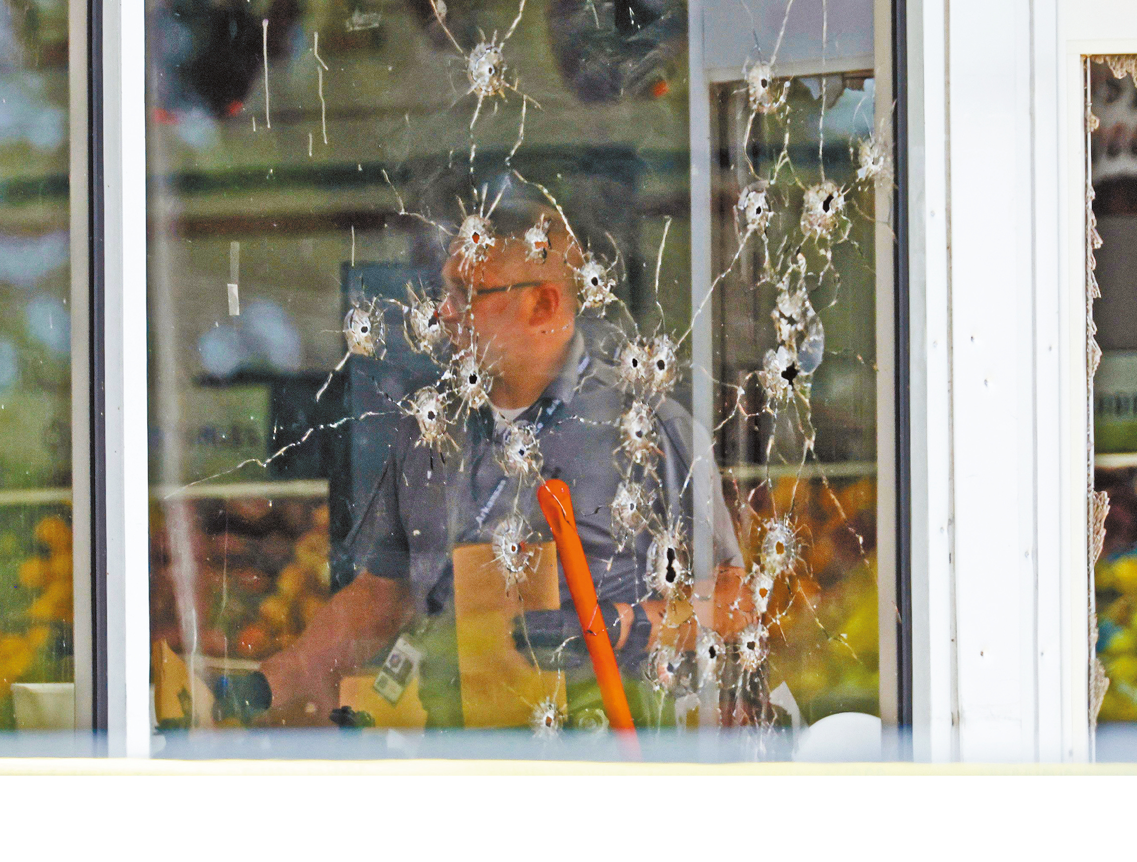 ▲阿肯色州一家超市發生槍擊案,造成3死10傷,圖為店內窗戶上布滿彈孔。 美聯社