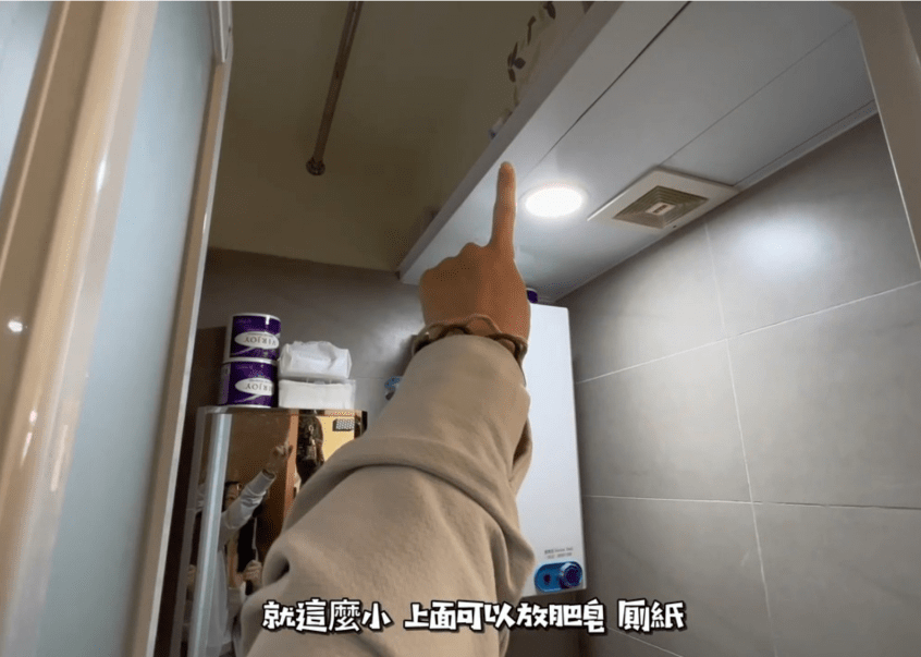 片中所見,她以$5,300月租的100呎的劏房單位,甫開門的左邊就是獨立廁所,但沒有干濕分離,并需要利用鏡后的柜及假天花來擺放番梔、廁紙等雜物。 大門亦不能完全打開,因門后擺放了袋、雨傘等物件。 玄關位則放了一個小衣架作為“迷你衣帽間”,掛了她和男友的衣服、襪及污糟衫等。