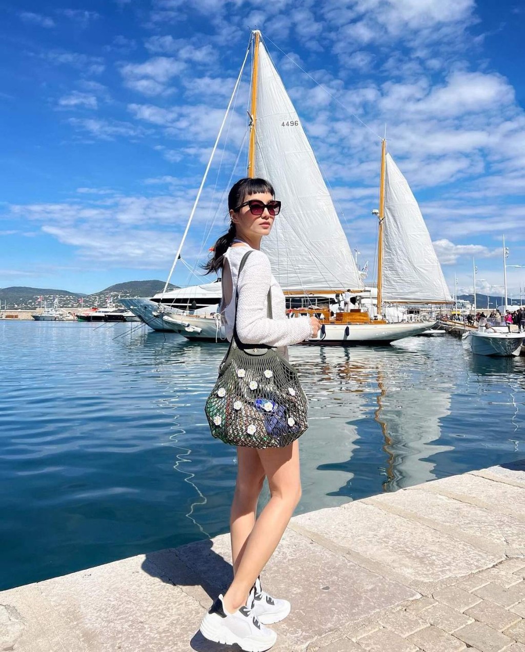 ▲香港女星陳嘉寶以熱褲及波鞋,配搭 Longchamp的Le Pliage Filet帆布拼牛皮網袋,散發度假氣息。 (圖片來源:IG@anjaylia)