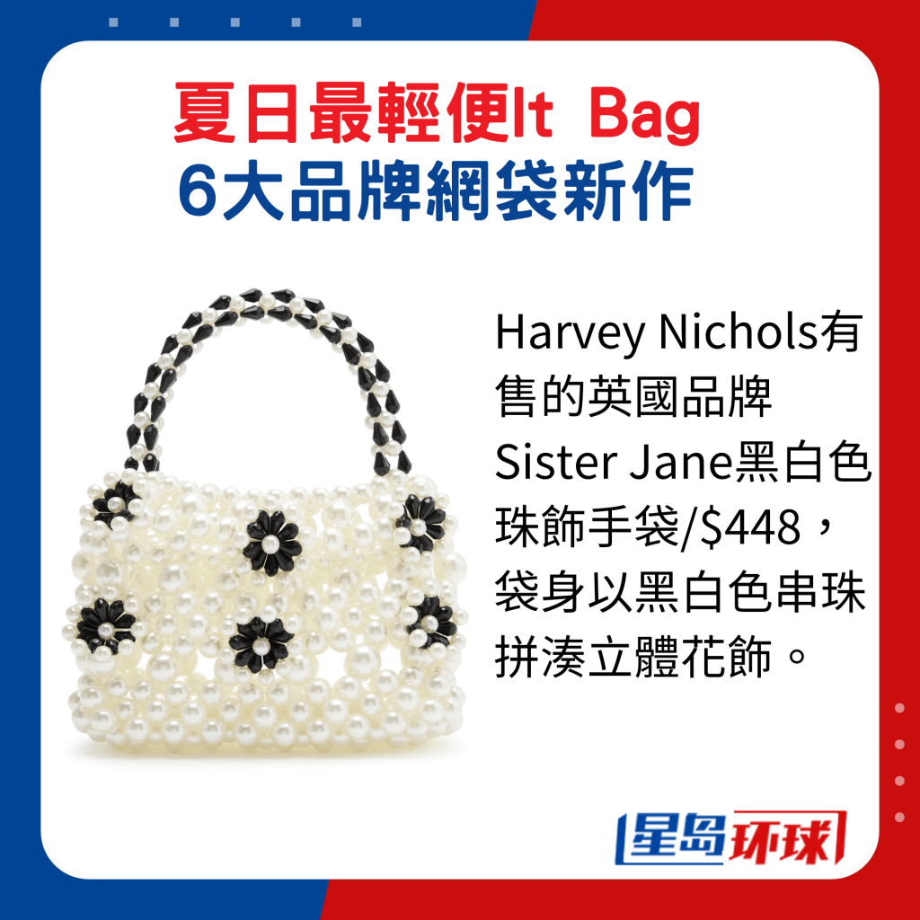 若想配搭優雅造型,可以選擇以水晶、緞帶及串珠作為綴飾的網袋設計。 云集多個時尚品牌的英國百貨店Harvey Nichols,其中來自意大利米蘭的飾物品牌Rosantica,新推出編織網袋,用上密鋪水晶裝飾,內附黑色緋布布袋,閃亮華麗, 是出席宴會派對的“最佳拍檔”。 另英國品牌Sister Jane的新作就以串珠編織而成,拼以黑白色立體花飾,營造強烈的對比視效。