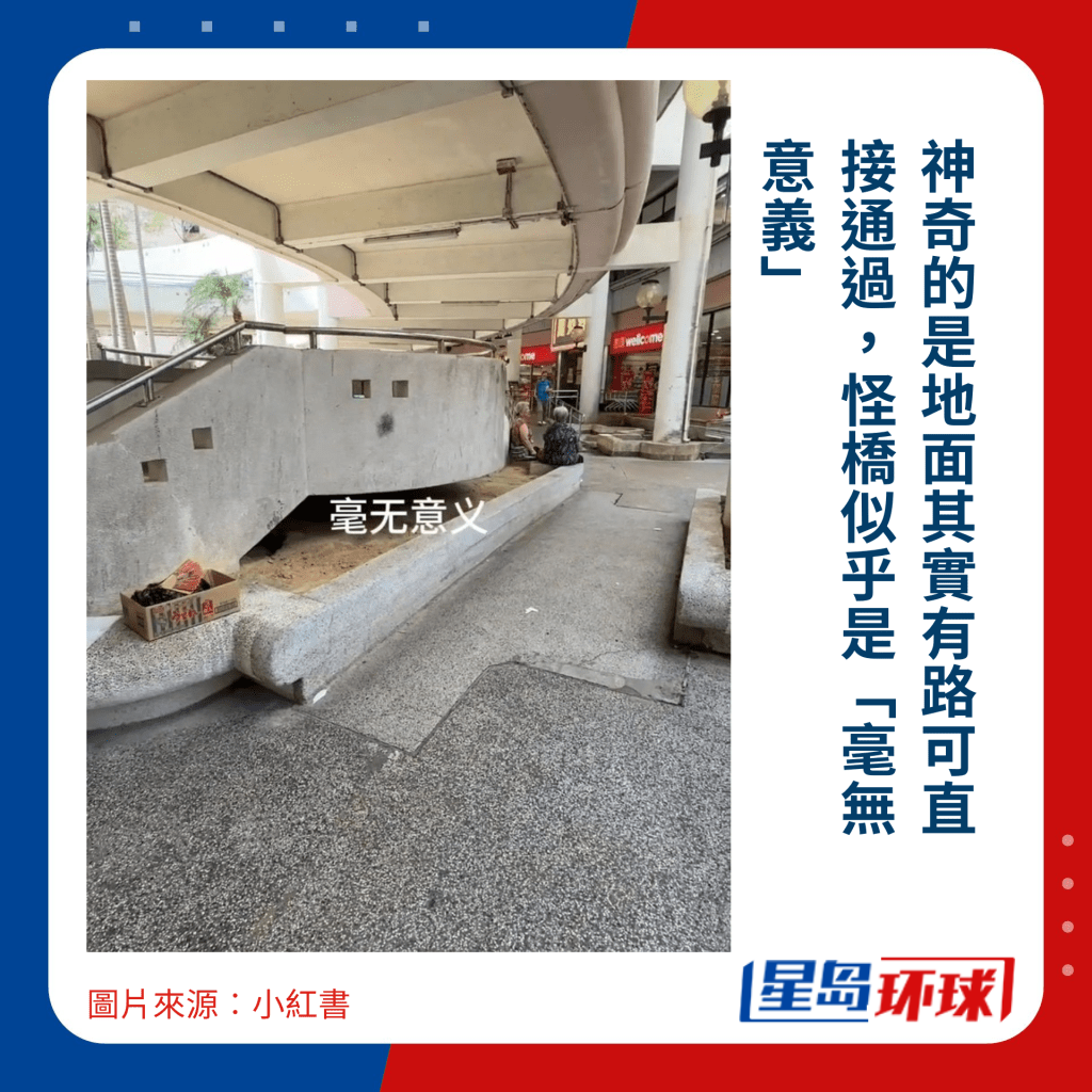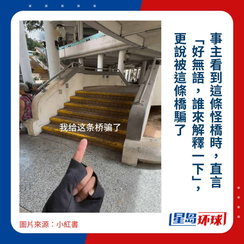 日前有位網民于小紅書上以“有人來解釋一下香港這是什么現象嗎!???”為題發文,分享在觀塘區翠屏邨商場休憩處發現的一座設計奇特的“怪橋”。事主看到這條怪橋時,直言“好無語,誰來解釋一下”,更說被這條橋騙了。怪橋兩邊各有六級,走上橋頂是個小平地,然后可直接走六級回地面,神奇的是地面其實有路可直接通過,怪橋似乎是“毫無意義”,更笑言跟她的畢業論文一樣都是“屎上雕花”,究竟是“哪個天才想出來的呀,太聰明了吧”。