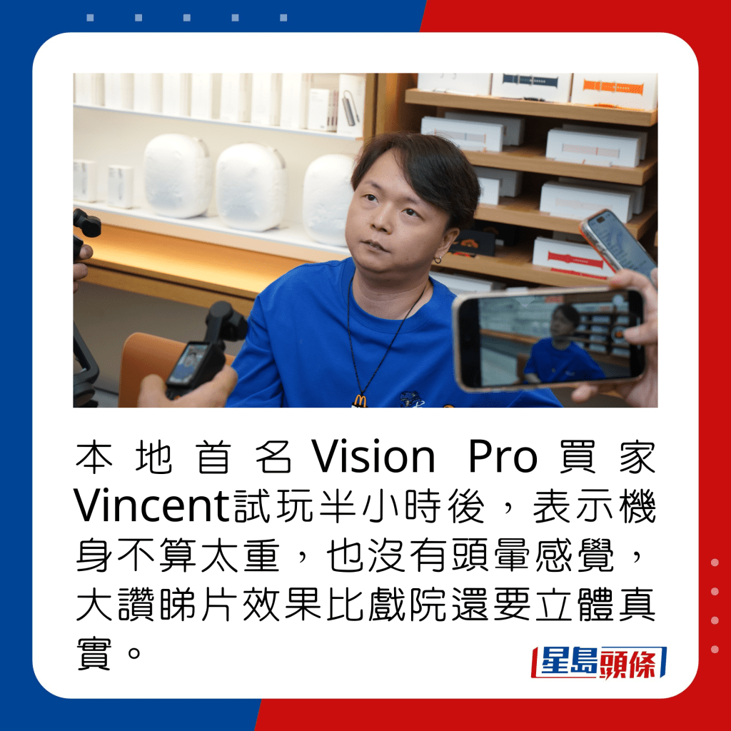 ▲本地首名Vision Pro買家Vincent試玩半小時后,表示機身不算太重,也沒有頭暈感覺,大贊睇片效果比戲院還要立體真實。