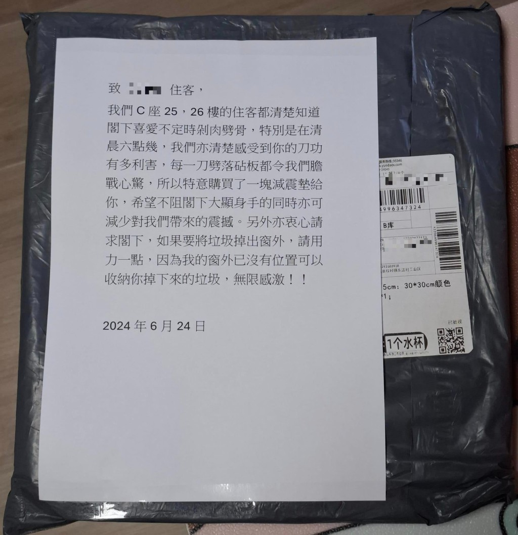 鄰居清晨剁肉噪音極滋擾!公屋住戶出奇招送幽默“降書”+1貼心物件
