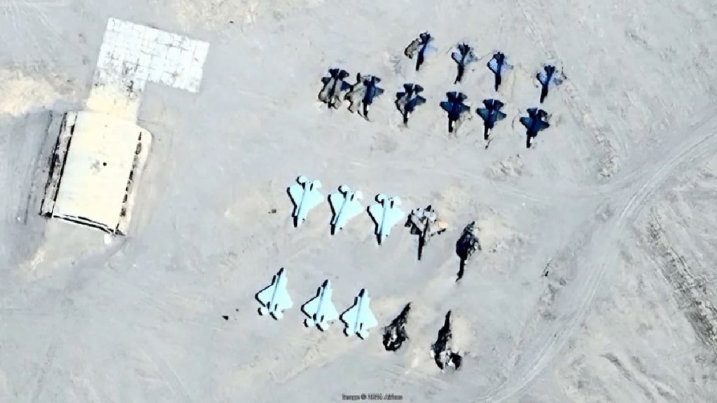 ▲衛星圖像顯示,新疆的靶場出現美軍的F-22與F-35隱形戰機的靶機 x@clashreport