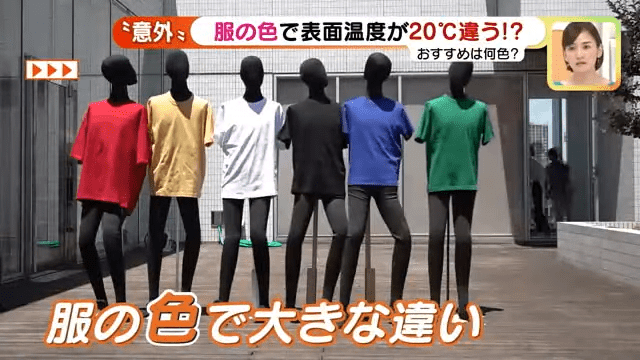 日本夏天炎熱程較香港有過之而無不及,為了消暑解溫,大家都會從衣著上入手,除了穿得透薄“少布”,顏色原來對于“吸熱度2有重要影響。日本電視節目《メ~テレニュース》就曾經進行了一個實試,把6件質地一樣而不同顏色的Tee置于正午12時30分的太陽底下曝曬,再于2.5分鐘、5分鐘后,以紅外線熱像儀探測一下,各種顏色Tee上吸熱度,亦再用溫度計探測Tee的溫度變化。