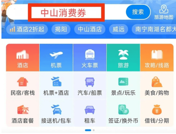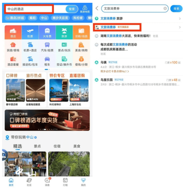 ▲攜程App消費券領取方法2:打開攜程旅行APP,首頁搜索框輸入“中山消費券”關鍵字,進入活動專題頁面根據提示領取。資料及圖片來源:微信@中山市商務局
