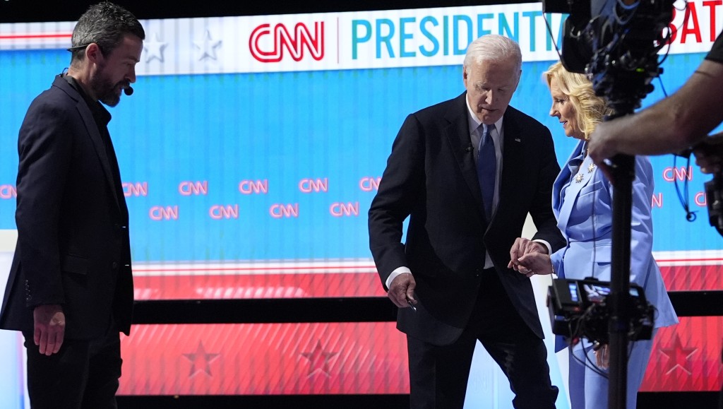 ▲拜登在完成辯論后,被妻子小心扶下只有一級樓梯的講臺。美媒認為,此顯示他身體不太受控制。美聯社